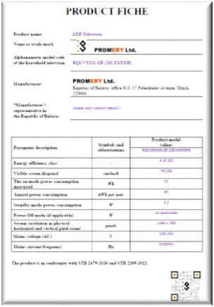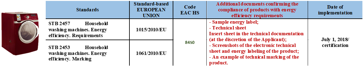 A series of standards on the energy efficiency of household appliances are based in the Republic of Belarus. The standards were developed on the basis of the COMMISSION DELEGATED REGULATIONS (EU) in terms of energy efficiency . At the same time, in the standards of Belarus, some terms have been modified, some requirements have been simplified, work has been carried out to modernize the energy efficiency label related to bringing the font sizes and icons used in the labels in line with the sizes of Cyrillic fonts and technical abbreviations, indications of the nationality of the label.