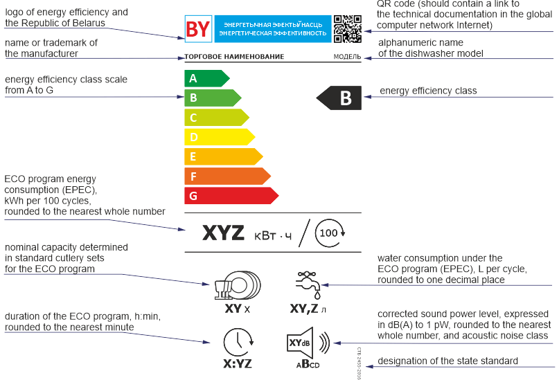 A series of standards on the energy efficiency of household appliances are based in the Republic of Belarus. The standards were developed on the basis of the COMMISSION DELEGATED REGULATIONS (EU) in terms of energy efficiency . At the same time, in the standards of Belarus, some terms have been modified, some requirements have been simplified, work has been carried out to modernize the energy efficiency label related to bringing the font sizes and icons used in the labels in line with the sizes of Cyrillic fonts and technical abbreviations, indications of the nationality of the label.