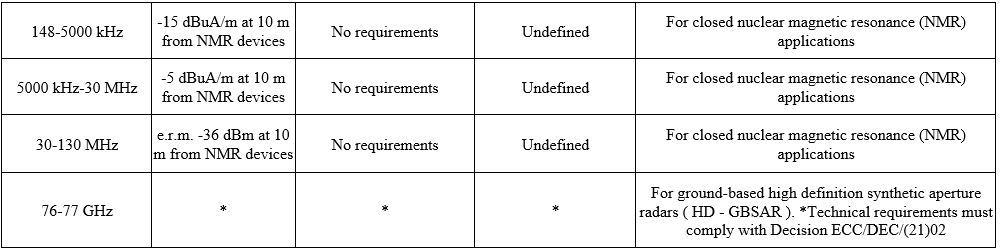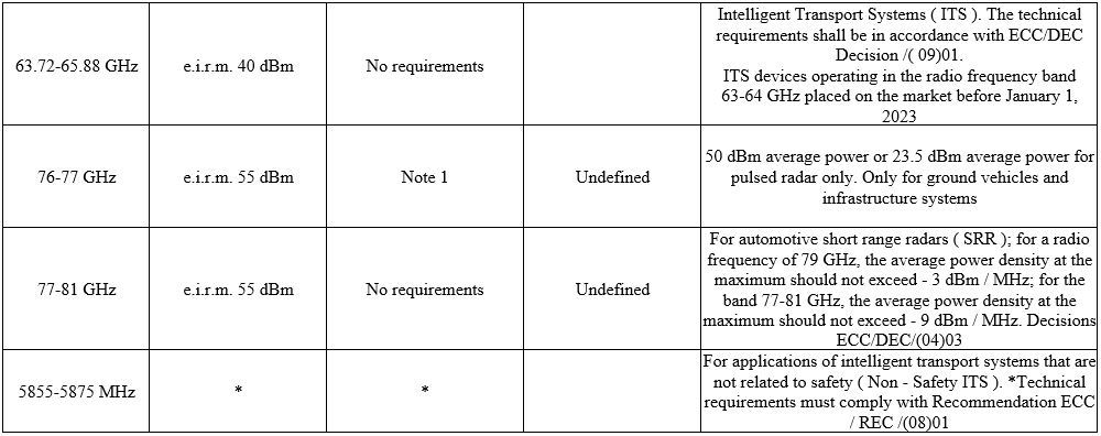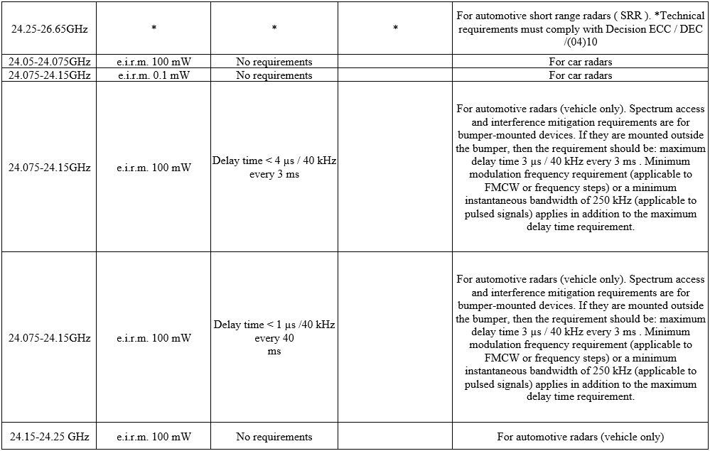 Further reading It should be noted that the regulation in the frequency bands 24.05-24.25 GHz for automotive radars does not provide for any time limitations. Only the 21.65-26.65 GHz and 24.25-26.65 GHz frequency bands for short-range radars (SRR) are time-limited.