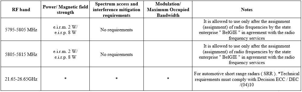 Note 2. Automobile radars do not require confirmation of conformity in terms of communication facilities in the Republic of Belarus.