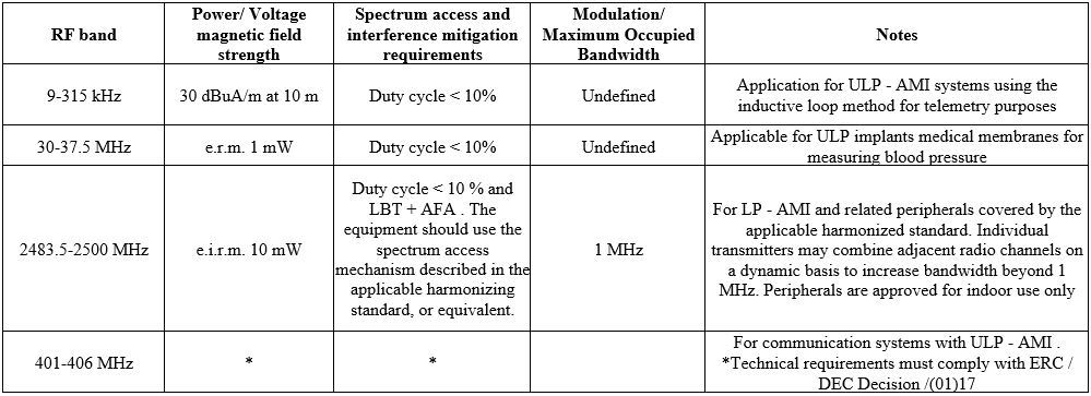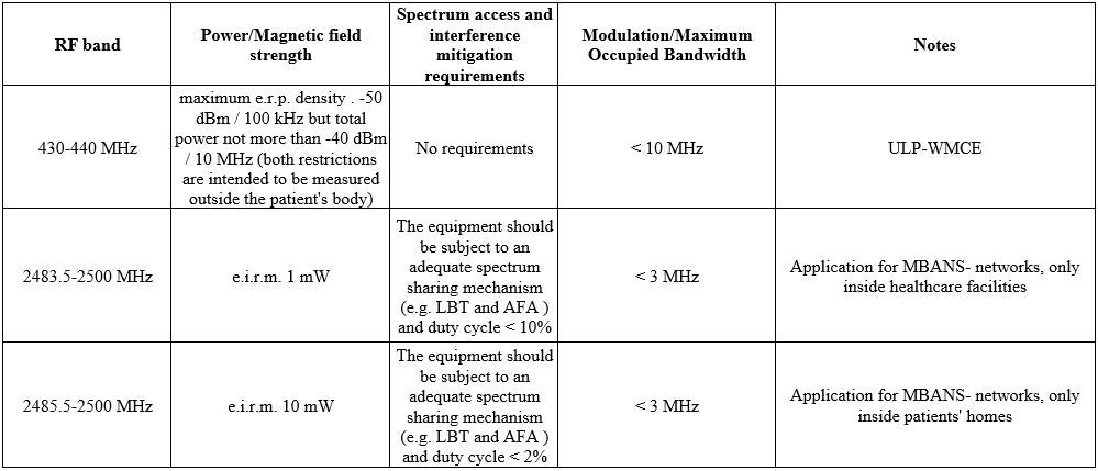 Radio frequency bands, as well as regulatory and information parameters recommended for active medical implant devices and their corresponding peripheral devices.