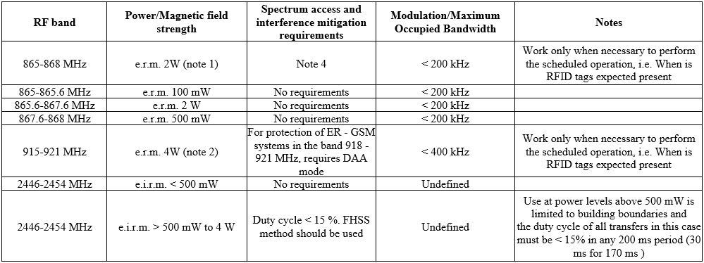 1.Request transmission in the 865-868 MHz band at ERP 2 W is allowed only in four channels with central frequencies of 865.7 MHz, 866.3 MHz, 866.9 MHz and 867.5 MHz with a maximum bandwidth of 200 kHz. RFID tags respond with a very low power level (ERP -20 dBm) in the frequency range around the channels of the RF queryer.