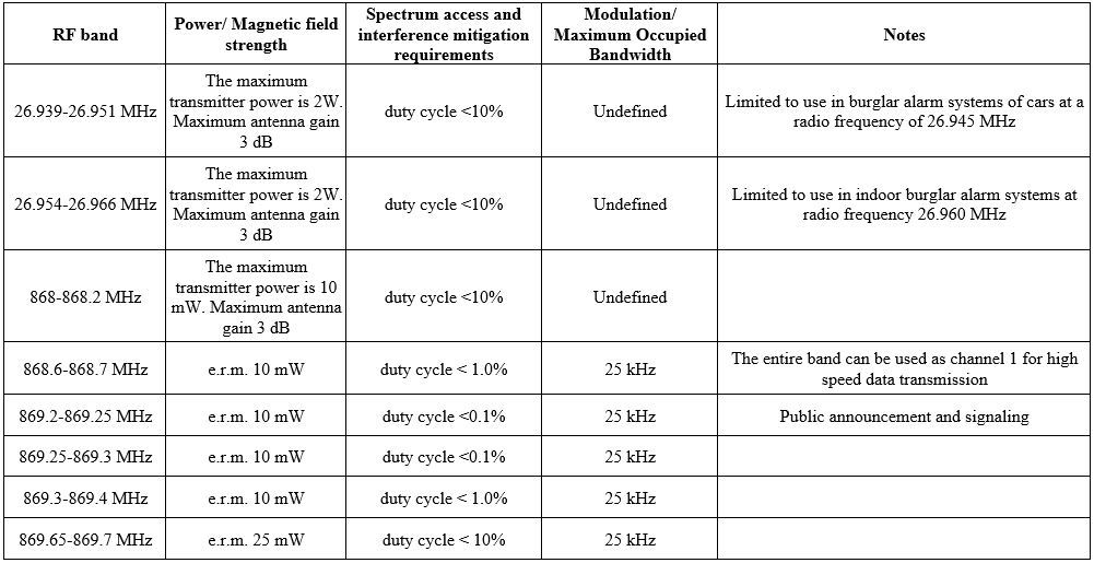 Radio frequency information, as well as regulatory and information parameters, mainly recommended for telemetry, telecontrol, signaling and data transmission systems in general, as well as for other similar applications. Video systems should preferably be used in bands above 2.4 GHz.