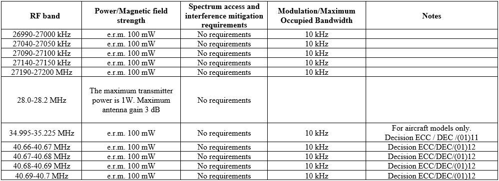 Radio frequency and regulatory and information parameters for model control systems and devices that are designed solely for the purpose of controlling the movement of models in the air, on land, above or below the surface of the water. These bands are not exclusive to this type of application.
