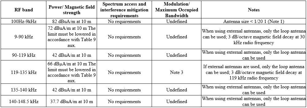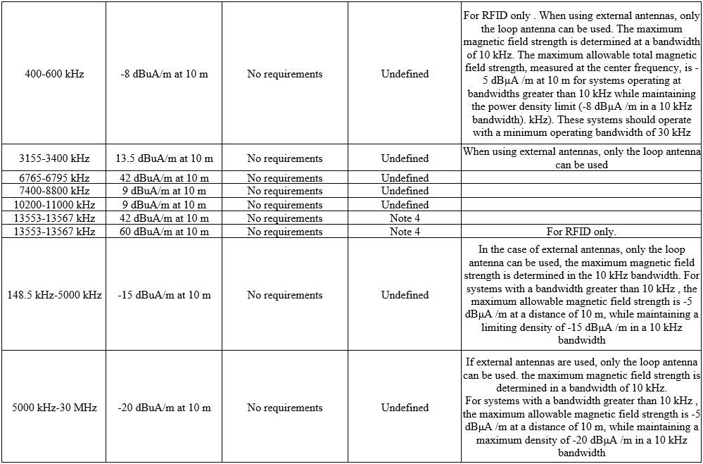 2.In the case of using an integral or remote frame antenna in the bands of 9-90 kHz and 119-135 kHz with an area between 0.05 sq. m and 0.16 sq. m., the field strength is reduced to 10 *Log (area / 0.16 sq. m.); for an antenna with an area of less than 0.05 sq. m. the field strength is reduced to 10 dB.