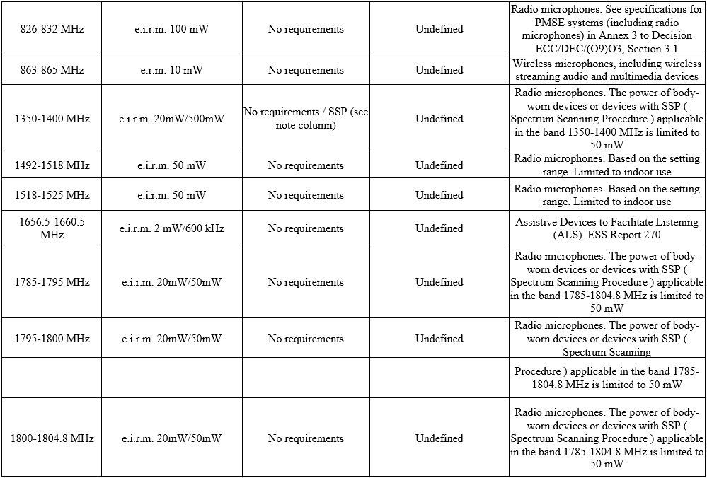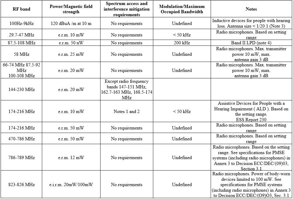 the radio frequency bands and the regulatory and informational parameters recommended for radio microphone systems (wireless microphones), including assistive hearing aids ( ALDs ). Radio microphones are small, low power (typically 50 mW or less) sound transmitters designed to be worn on body, hands. Receivers are tailored to a specific use and can range in size from small and portable to mounted as part of a multi-channel system. This Annex covers professional and consumer radio microphones, both hand-worn and body-worn, in-ear monitors for use in concerts or other stage productions, and assistive hearing aids ( ALDs ). ALD these are specific radio microphone systems that capture the acoustic signal transmitted over the radio for listening on an auxiliary receiver.